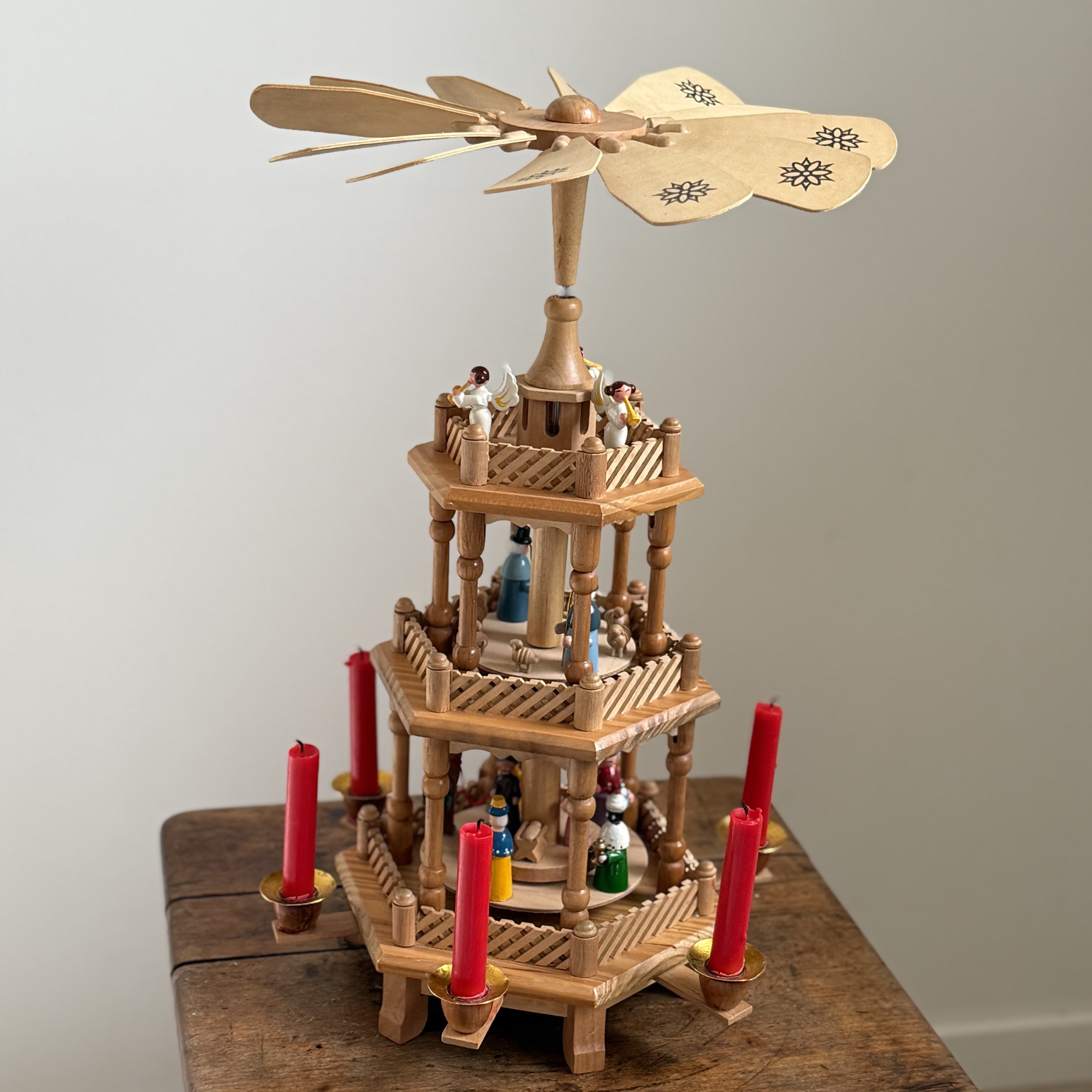 Tyske julepyramider er en unik og traditionel julepynt, der stammer fra den historiske Erzgebirge-region i Tyskland. Disse arkitektoniske skulpturer har en pyramideformet struktur, der er designet til at holde stearinlys, som genererer varme, varmen fra lysene får propellen til at snurre rundt. Pyramiderne er udsmykket med detaljerede figurer såsom engle, vise mænd, og scener fra julekrybben, pyramiden fungere ikke kun som dekoration, men også som et symbol på at bringe lys ind i det vintermørke, der præger juletiden. Hver pyramide bærer en unik historie og håndværk, pyramiderne er brugte genstande fra flere års anvendelse. Forvent derfor naturlige brugspor som stearinrester, brændmærker og støv, hvilket vidner om deres historiske charme. Et meget lille kærligt puf på propellen kan være nødvendigt nogengange for at hjælpe den igang i starten.